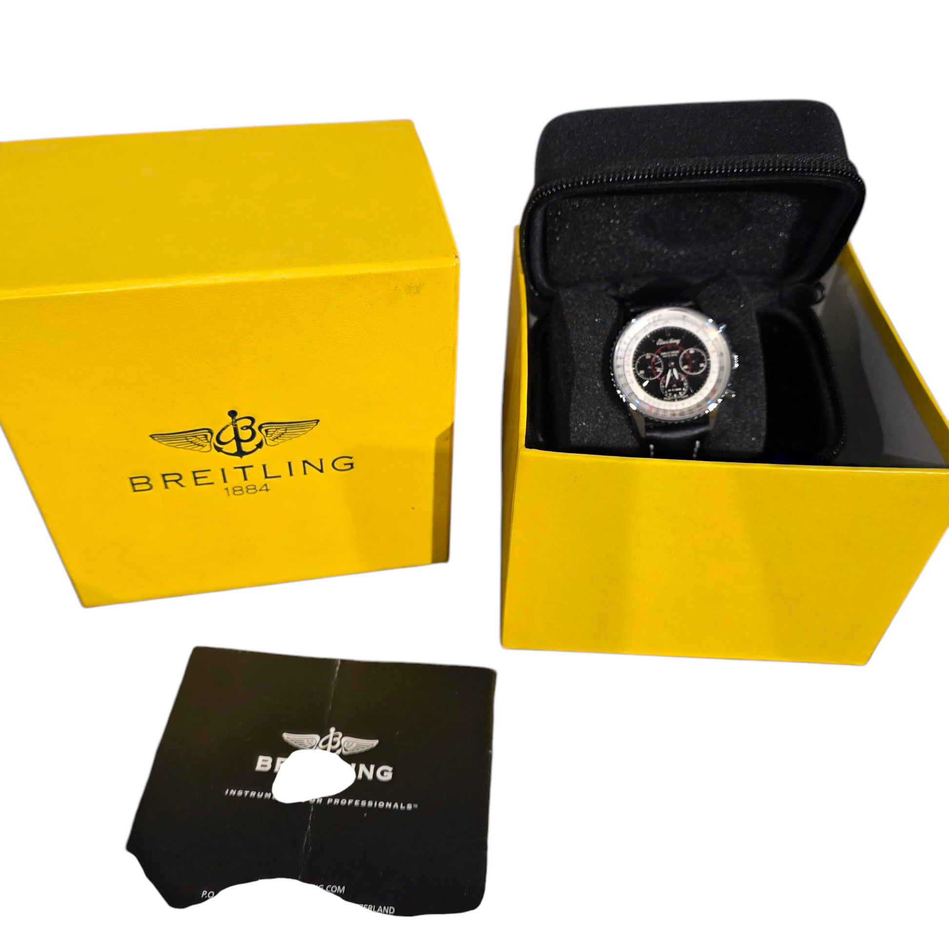 Vendue avec la boite de service , surboite Breitling , notice , certificat d'authenticité et facture de révision.